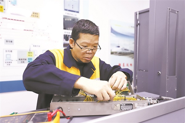 此后3個(gè)月,他每天下班后多留一小時(shí),繪制電路原理圖,推演電路邏輯,常為設(shè)定一個(gè)參數(shù)熬至深夜。為了確定最佳電源電壓,他連續(xù)一周開展測(cè)試,數(shù)據(jù)記滿3個(gè)筆記本。沒有專用工具,他就用銼刀、烙鐵手工制作;信號(hào)傳輸不穩(wěn)定,就一次次調(diào)整電路布局。經(jīng)過反復(fù)改進(jìn),他成功搭建起車載設(shè)備室內(nèi)檢修試驗(yàn)平臺(tái)。車間副主任付瑜忠評(píng)價(jià)說:“有了這個(gè)平臺(tái),不用上車就能完成TAX等設(shè)備檢修和模擬試驗(yàn),大幅提升了檢修效率。”