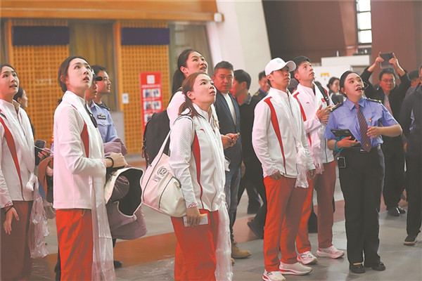 奧運(yùn)冠軍參觀(guān)青藏鐵路精神展廳。周悅翔 攝