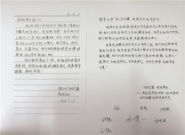 此前,四位同學(xué)已看過(guò)奧運(yùn)冠軍在林芝的宣講新聞,能在列車(chē)上與冠軍“隔空相遇”,讓他們既驚喜又遺憾。因?qū)嵺`支隊(duì)需趕往下一站開(kāi)展宣講和志愿活動(dòng),他們沒(méi)有時(shí)間與冠軍們當(dāng)面交流。“兩支宣講隊(duì)伍,一個(gè)在學(xué)術(shù)領(lǐng)域刻苦鉆研,一個(gè)在體育賽場(chǎng)上不懈拼搏,我們都在為建設(shè)祖國(guó)而奮斗。”實(shí)踐支隊(duì)隊(duì)長(zhǎng)左宏量說(shuō)。當(dāng)隊(duì)員王珺儀提議寫(xiě)一封信轉(zhuǎn)交奧運(yùn)冠軍時(shí),大家都為這個(gè)想法感到興奮,迅速著手起草。信中,四位清華學(xué)子寫(xiě)下了他們的心聲: