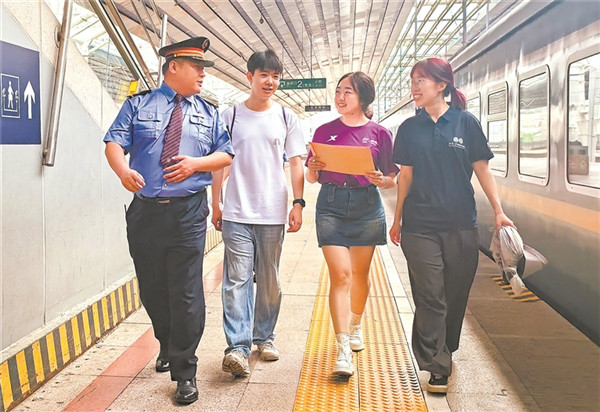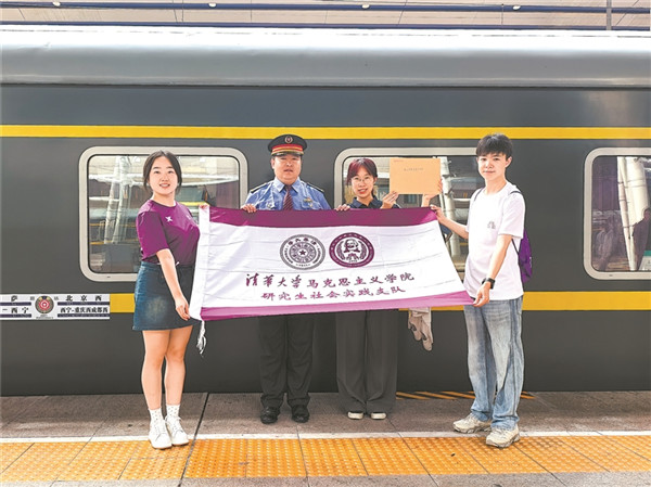 Z22次列車(chē)長(zhǎng)司文東在北京西站交付信件后與清華學(xué)子合影。李 磊 攝